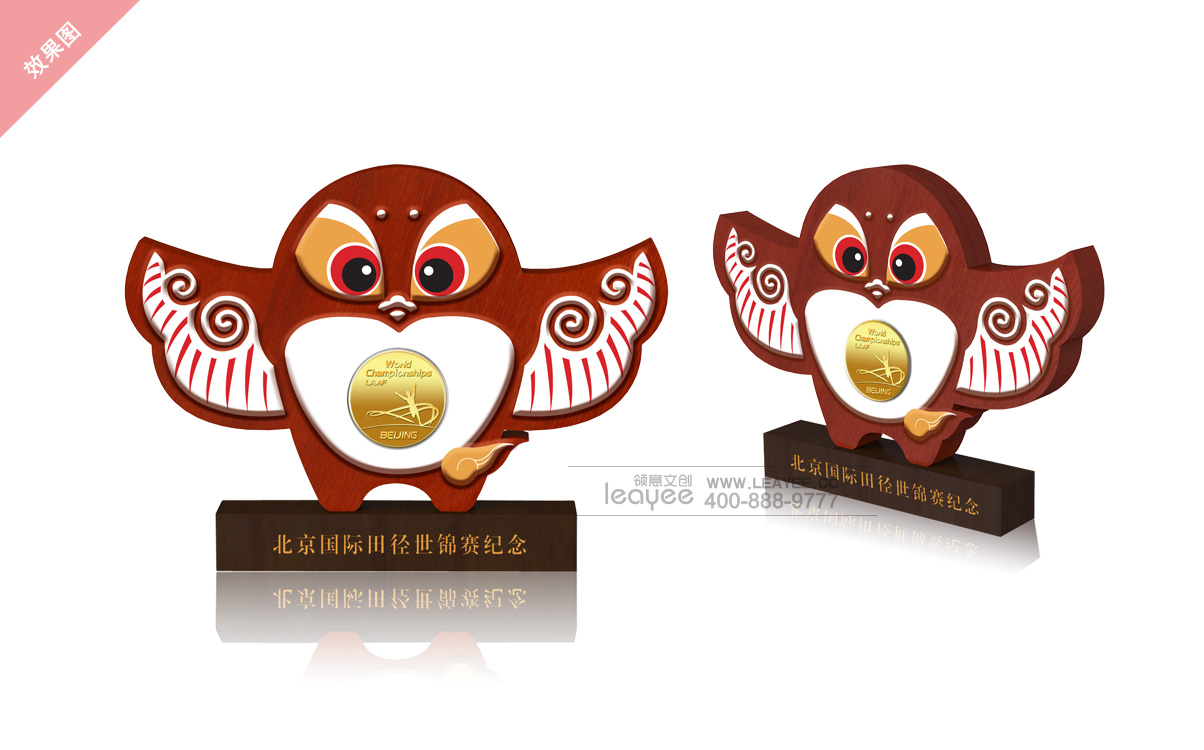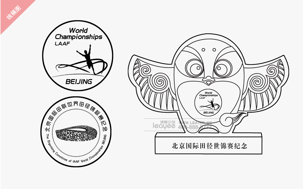 设计方案: 2015年北京国际田联世界田径锦标赛吉祥物“燕儿”集合燕子、沙燕风筝、京剧脸谱三大视觉形象于一体。三者合一,把田径的魅力、 北京人民的祝愿、中国的传统融会一体。而田径运动在国内有着深厚的群众基础,世锦赛期间,这必将进一步推动田径运动和田径文化的普及,尤其是在青少年和校园群体中的普及。特许定制世锦赛相关纪念礼品,用以田径运动的普及,以及感谢广机关团体,市民等民间组织为世锦赛的成功举办做出的贡献