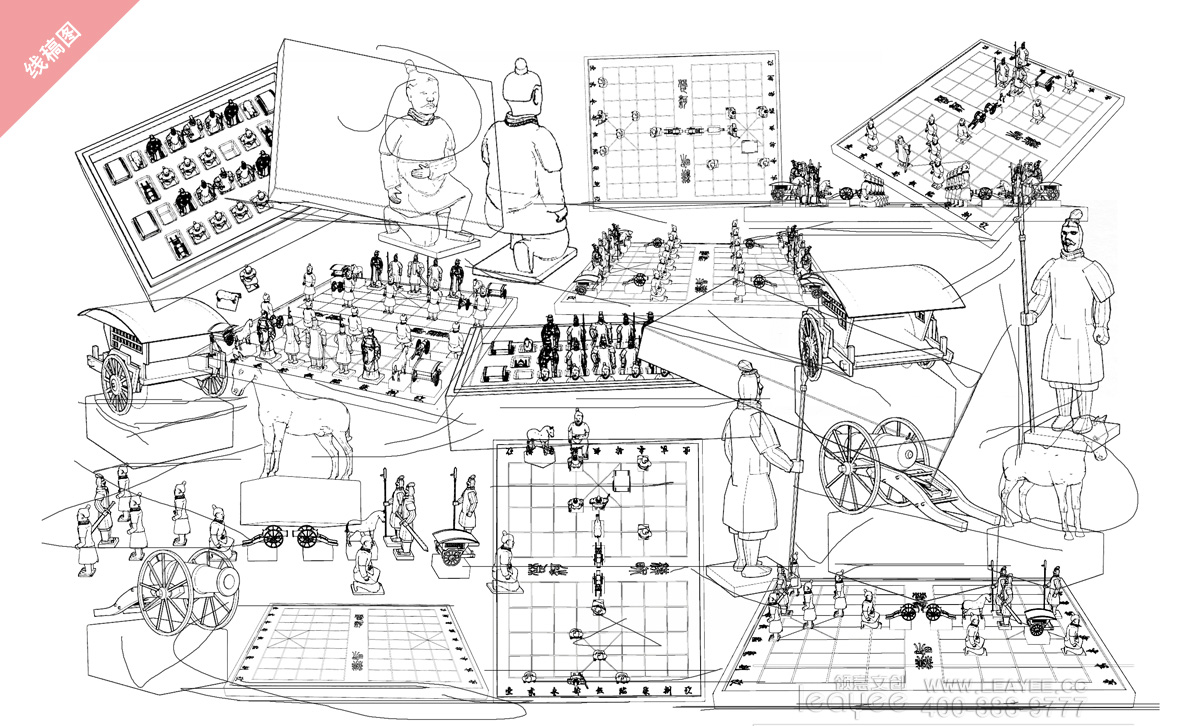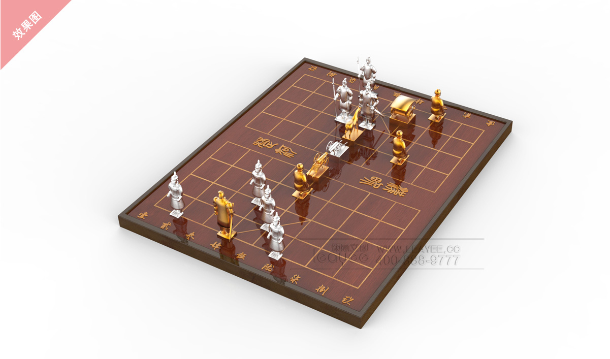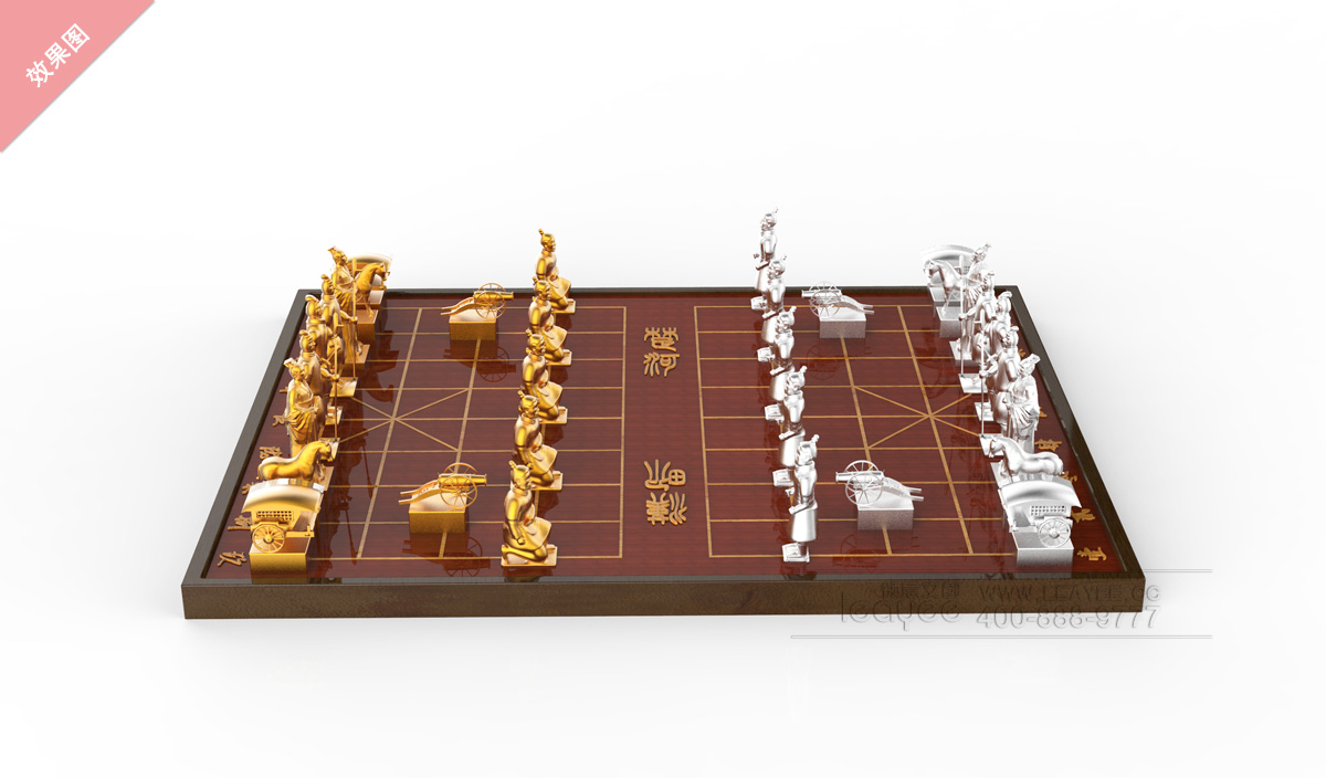 设计方案: 秦兵马俑场面宏大,威风凛凛,队列整齐,展现了秦军的编制、武器的装备和古代战争的阵法。显示了秦始皇威震四海、统一六国的雄伟军容,表现了极高的造型艺术,是世界上独一无二的文化艺术宝库。将其创造性的与中国象棋结合,更是将古代厮杀凛冽,威武雄壮的场景再现于现实生活中,一显中国军事之风采。