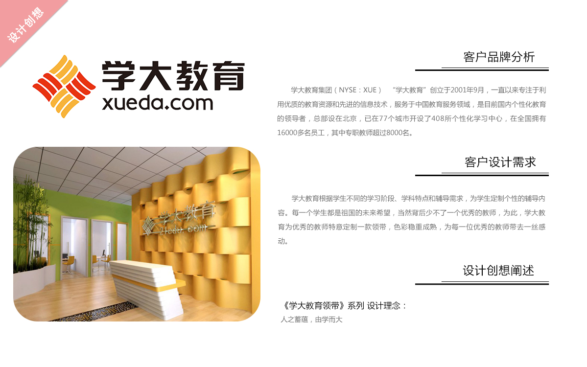 设计方案: 学大教育根据学生不同的学习阶段、学科特点和辅导需求,为学生定制个性的辅导内容。每一个学生都是祖国的未来希望,当然背后少不了一个优秀的教师,为此,学大教育为优秀的教师特意定制一款领带,色彩稳重成熟,为每一位优秀的教师带去一丝感动。