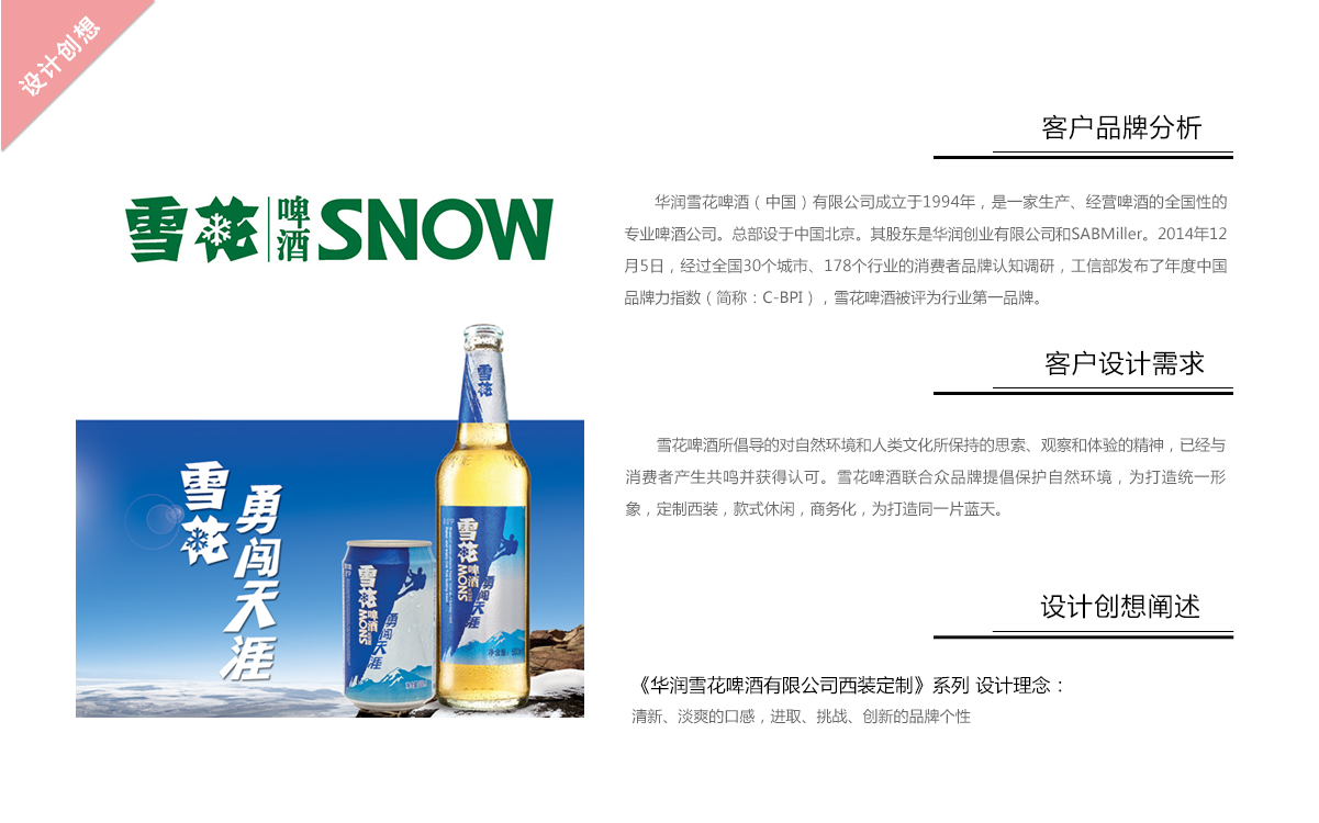设计方案: 雪花啤酒所倡导的对自然环境和人类文化所保持的思索、观察和体验的精神,已经与消费者产生共鸣并获得认可。雪花啤酒联合众品牌提倡保护自然环境,为打造统一形象,定制西装,款式休闲,商务化,为打造同一片蓝天。