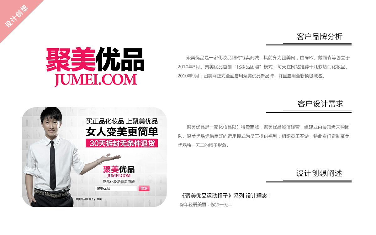 设计方案: 聚美优品是一家化妆品限时特卖商城,聚美优品诚信经营,组建业内最顶级采购团队。聚美优品凭借良好的运用模式为员工提供福利,组织员工春游,特此专门定制聚美优品独一无二的帽子形象。